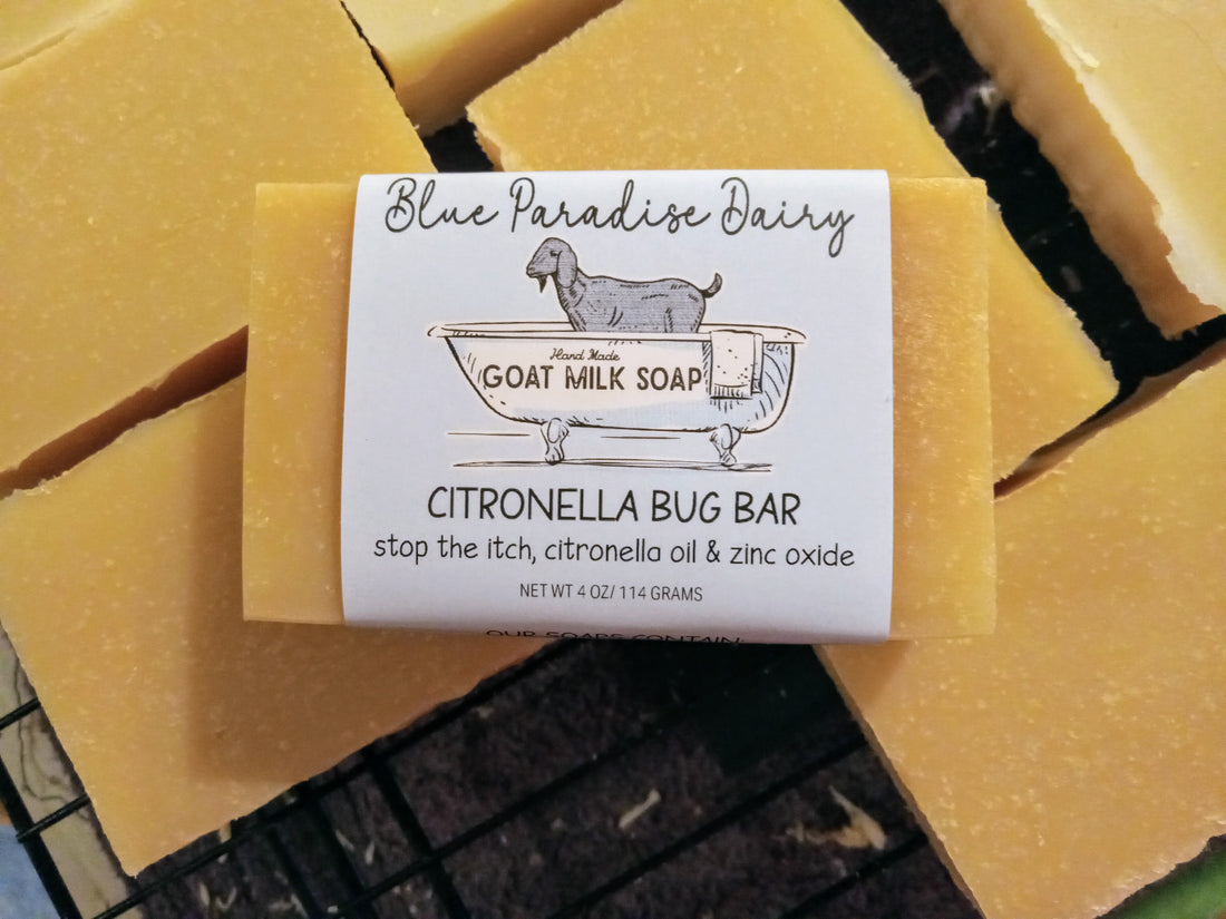 Our Citronella Bug bar is my own recipe for preventing and healing bug bites. Citronella oil and Zinc.